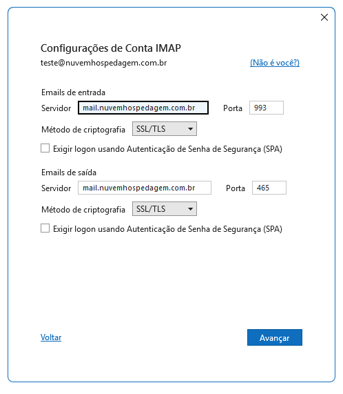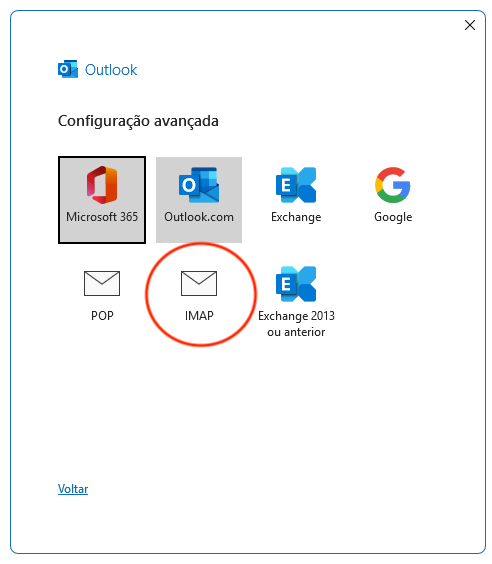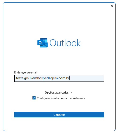 Nas versões atualizadas do Outlook, o software puxa todas as configurações de forma automática e irá concluir. Se por acaso não configurar, irá aparecer uma tela de configuração avançada e clique em IMAP.