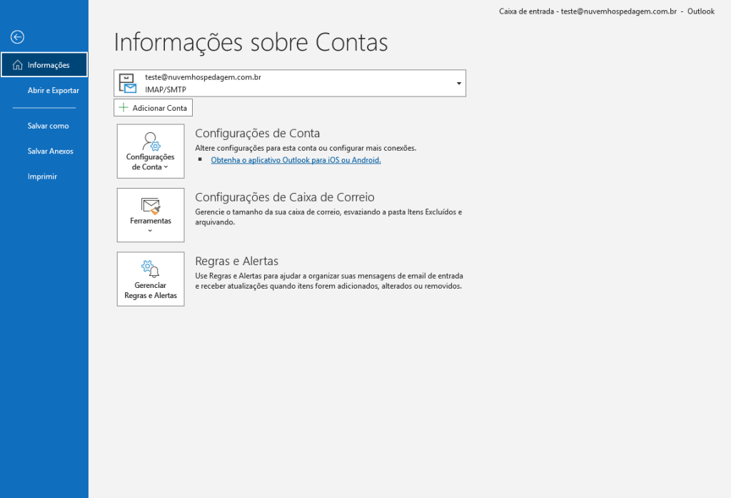 Abra o Microsoft Outlook. No canto superior esquerdo, clique em Arquivo e em seguida em Adicionar Conta.