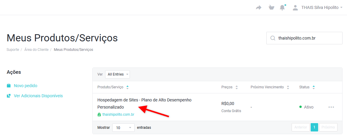 02. Clique no serviço de hospedagem que está ativo e que deseja alterar a versão do PHP.