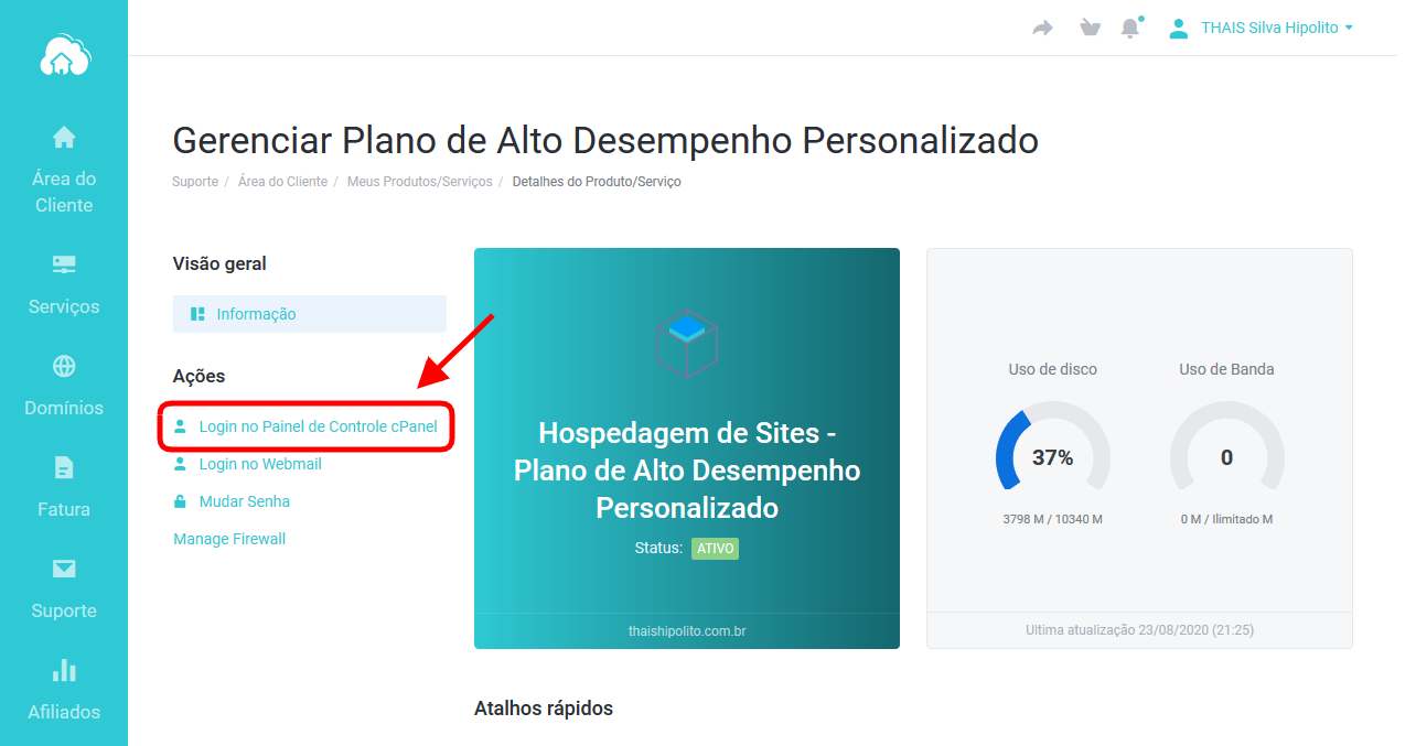 03. Na tabela do lado esquerdo em "Ações" clique em "Login no Painel de Controle cPanel".