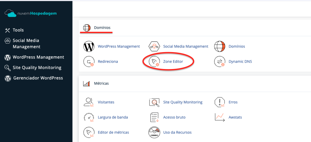 Acesse o cPanel da sua hospedagem, utilize a barra de pesquisa no topo e digite Zone Editor. Clique no ícone que aparecer como resultado.
