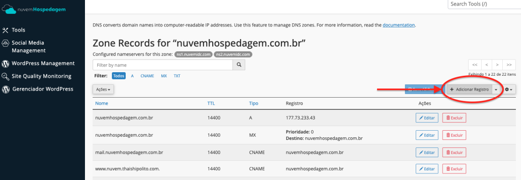 Você verá a tabela com todos os registros ativos do domínio. Para adicionar um novo, clique no botão + Adicionar Registro no topo da lista e preencha os campos: