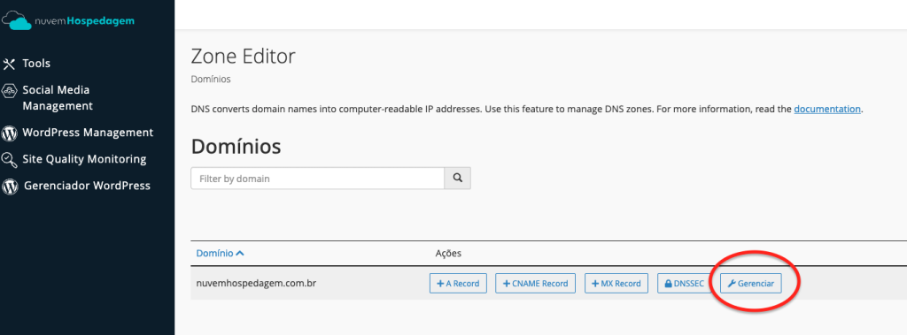 O sistema listará todos os domínios vinculados à sua conta. Localize o domínio que deseja configurar e clique em Gerenciar.